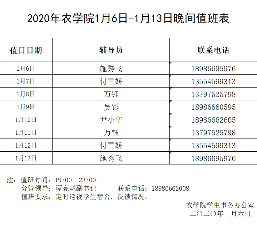 2020年开云足球体育(中国)官方网站1月6日-1月13日晚间值班表