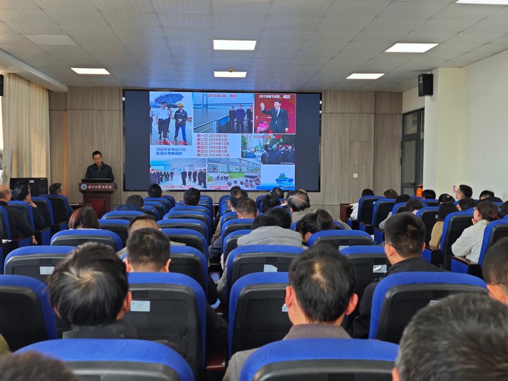 周锦华以“学习贯彻习近平总书记考察湖北重要讲话精神”为题,结合湖北省委、荆州市委、学校党委关于传达学习习近平总书记考察湖北重要讲话精神的有关要求,系统梳理了党的十八大以来,习近平总书记先后六次到湖北调研考察,对湖北工作作出的重要讲话和重要指示批示精神,特别是习近平总书记赋予湖北“建成支点、走在前列、谱写新篇”的目标定位,提出了“四个着力”( 2013年7月)、“四个切实”( 2018年4月)、“ 四点明确要求”(2024年11月)等重要要求,为湖北改革发展擘画蓝图、指路引航,有力推进了中国式现代化湖北实践。周锦华结合省委发出的“奋力推进中国式现代化湖北实践”动员令——“五个功能定位”、“五个以”实践体系、“五个一”推进机制、“五个关系”,要求广大党员、教师增强“四个意识”、坚定“四个自信”、做到“两个维护”,不断增强对推进中国式现代化湖北实践的政治认同、思想认同,落实立德树人根本任务,以强农兴农为己任,为奋力推进中国式现代化湖北实践提供智力支持和人才支撑。